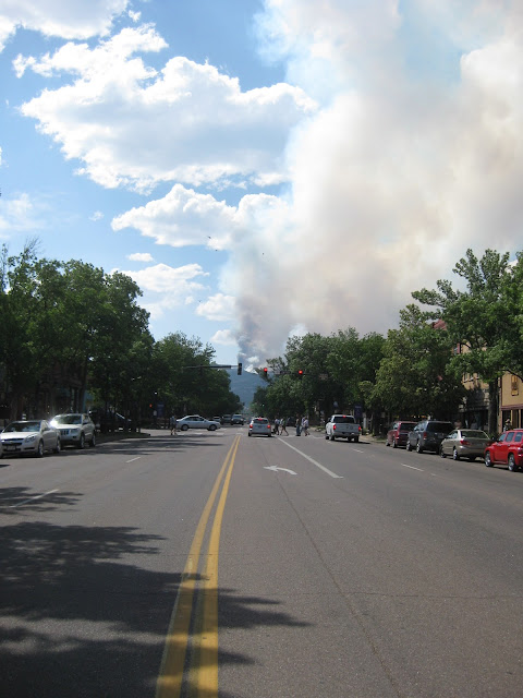 Just to update everyone about the fire. On Tuesday, June 26 at around 4:00 PM winds came down from a storm up north and created 65 mile an hour wind shears that pushed the fire up on the mountain range down into the Mountain Shadows Subdivision and then the Peregrine area burning upwards to 300 homes. Several friends have lost their homes. Around 32,000 people are evacuated from their homes. This is a succession of photos I took this morning from inside our car coming down from the east on Woodmen: