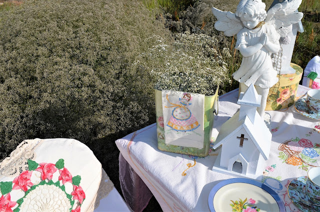 DeleteWhat a beautiful spot to set up a tea table! Those baby breaths are amazing! I would love to someday go out west and see your lovely area. You found some darling birdhouses and the tea cloth is so cute! Love your tea set and the plate with the blue edging and rose so pretty! I also enjoyed seeing your chair covers again! Thank you so much for featuring my tea I had last week! You made my day! And again, thank you for hosting your weekly tea party. I always look forward to it!