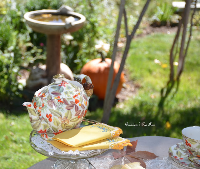Every thing is so pretty Bernideen! Love your autumn tea set and the beautiful way you always decorate your tea table! You found a beautiful throw and I like the granny square one too! Yes, we need to enjoy our beautiful fall weather! Thank you for hosting and have a wonderful week!